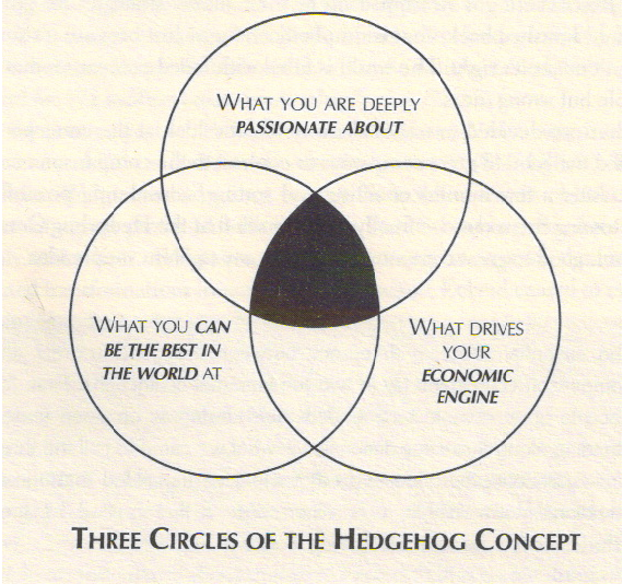 note: the most important word in this Hedgehog sentence is can. It's not what are you the best in the world at (maybe it's not on purpose,) or what do you want to be the best in the world at (could be unrealistic.) Maybe you can only be the best in the world at making widgets that fit widget machines in Scandinavia, or advising females under thirty on investing in ethical funds in North America, or wedding planning in the tri-state area for under $20,000. Or maybe it just one thing you sell, such as...